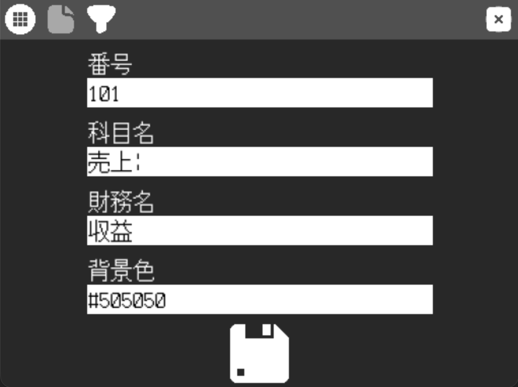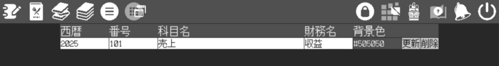 勘定科目画面で勘定科目を入力していきます。下のアイコンをクリックします。
